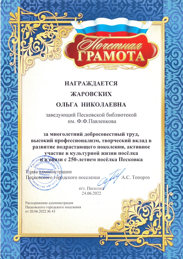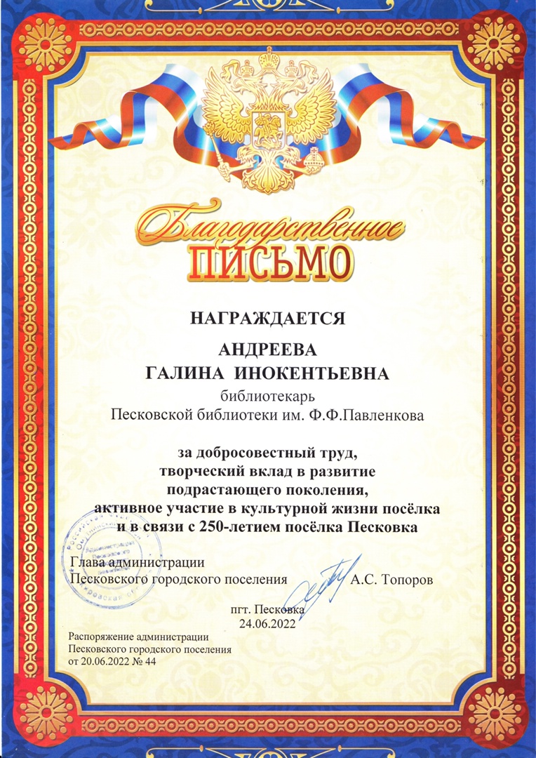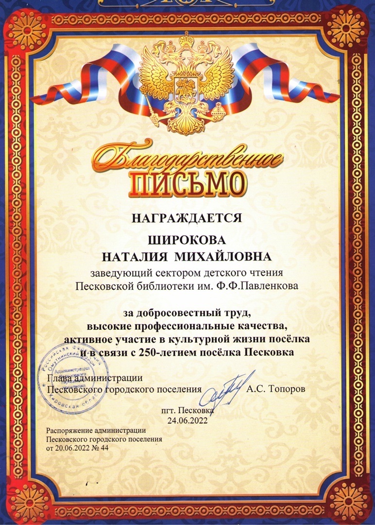 Для песковчан и гостей в библиотеке им. Ф.Ф. Павленкова была организована интересная творческая площадка, посвященная юбилейному событию. Состоялось торжественное награждение дипломами участников поэтического флешмоба "Ода родному поселку". Сладкие призы предоставил глава администрации городского поселения Александр Степанович Топоров.